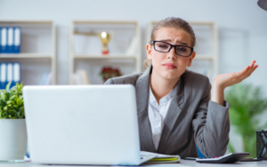 Mulher em escritório com expressão de dúvida