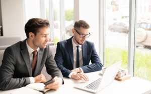 2 homens observam dados no notebook