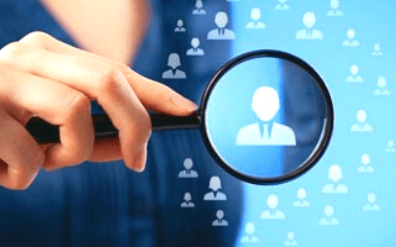 mão feminina segura uma lupa focando uma pessoa dentre outras