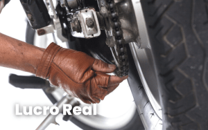 Mecânico com luva, verifica a corrente da moto, abaixo há o título: LUCRO REAL