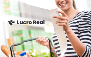 Mulher confere lista de compras, título LUCRO REAL