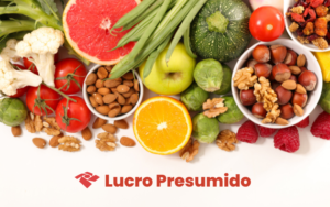 Diferentes frutas e verduras, com o título abaixo: LUCRO PRESUMIDO