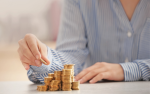 Mulher conta moedas e as empilha